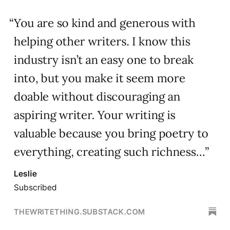This is the first and only free article for February, friends. I so hope you’ll consider joining The Write Thing community! At the end of this month members will have the opportunity to ask questions and participate in a live Zoom conversation about anything and everything that’s on your mind. And I’d like to thank my paying subscribers by highlighting some of the kind words they shared when they decided to contribute to The Write Thing. Thank you for being here. I hope this community is a place where you feel welcome and grow in your art.